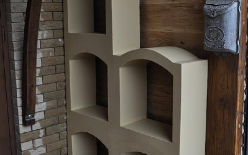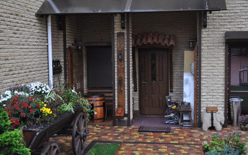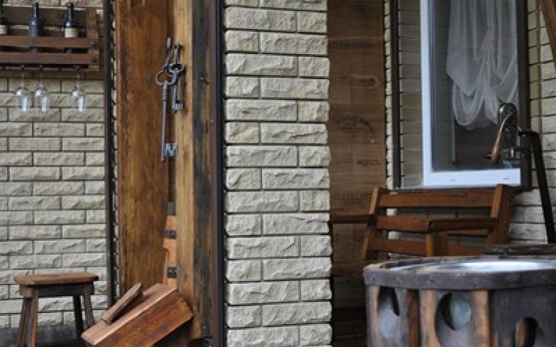 Дерев'яна підлога з сухостійного дуба. Система зберігання на основі бетонних каз. Одна зі стін оздоблена кришками від ящиків «з-під віскі». Козирок над вхідними дверима з дубової клепки і черепиці «татарки». Ну, і звичайно, меблі та освітлення в нашому стилі, а також багато вінтажних дрібниць - стара голландська поштова скринька, зв'язка раритетних ключів, дверний дзвоник дев'ятнадцятого століття та ін.
